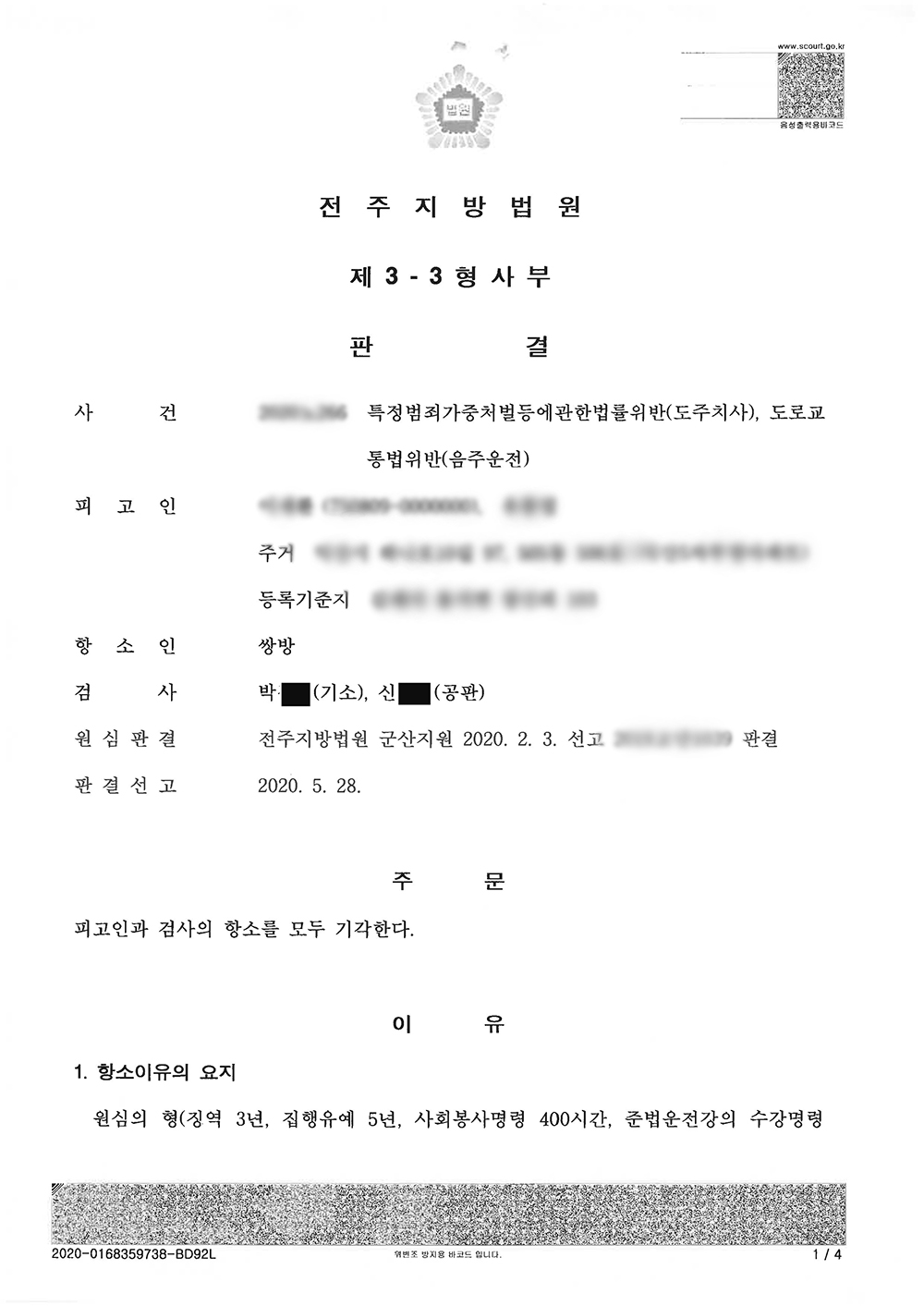 형사 [최낙준 변호사] 특정범죄가중처벌등에 관한 법률위반(도주치사), 도로교통법위반(음주운전) 페이지 정보 작성자 가인로 댓글 0건 조회 2,991회 작성일 20-07-29 11:07 본문 특정범죄가중처벌등에 관한 법률위반(도주치사), 도로교통법위반(음주운전) 목록 이전글[최낙준 변호사] 마약류관리에관한법률위반(향정) 20.07.29 다음글[최낙준 변호사] 영업정지처분취소 20.07.29